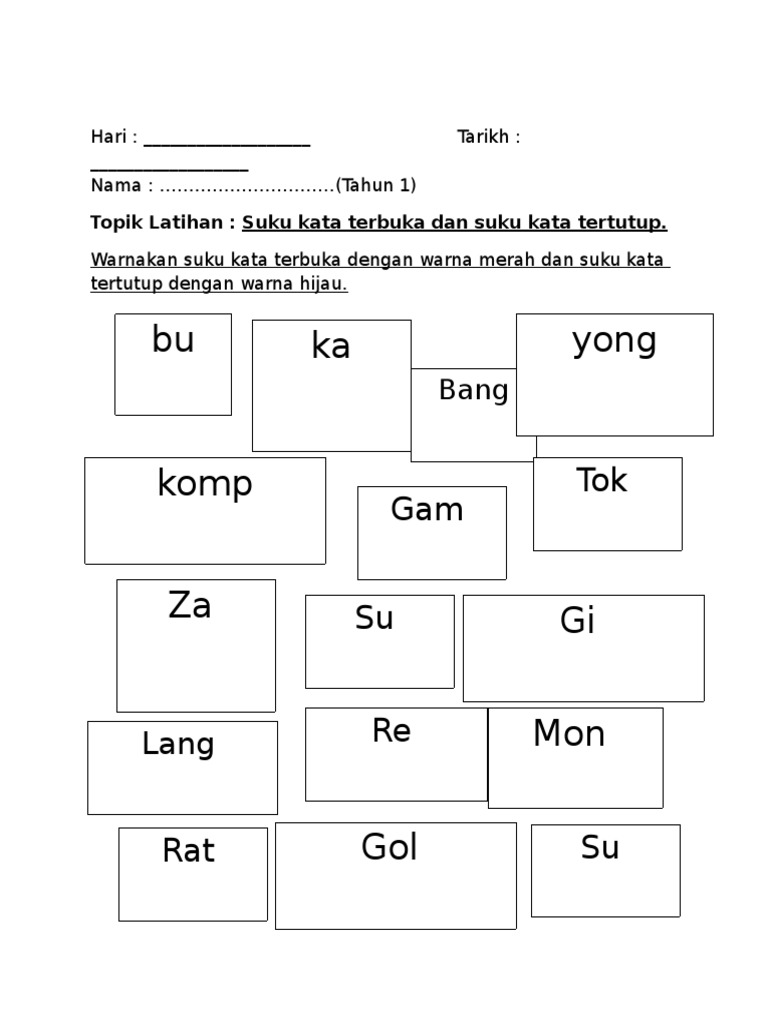 Posted by voo chai ha at 10:55 pm. Perkataan suku kata terbuka merupakan perkataan yang berakhir dengan suku kata terbuka iaitu huruf vokal. Suku kata ialah unit penyusunaturan bunyi pertuturan. Marilah kita belajar membaca perkataan di bawah! Download as docx, pdf, txt or read online from scribd. Baca cepat bm suku kata terbuka kvkv sampai lancar #sukukataterbuka #bahasamelayu. Latihan suku kata tertutup latihan ini mengandungi 20 soalan (4 muka surat). Suku kata terbuka kvkvkv created using powtoon free sign up at www.powtoon.com/youtube/ create. Seronoknya belajar tatabahasa tahap 1 (preview for. Savesave latihan suku kata terbuka.docx for later. Latihan ini membolehkan murid menguasai suku kata terbuka kv, suku kata tertutup kvk dan juga perkataan dua suku kata kv+kvk. Yatt & sil kidz tv. Langkah 1 suku kata terbuka.wmv.