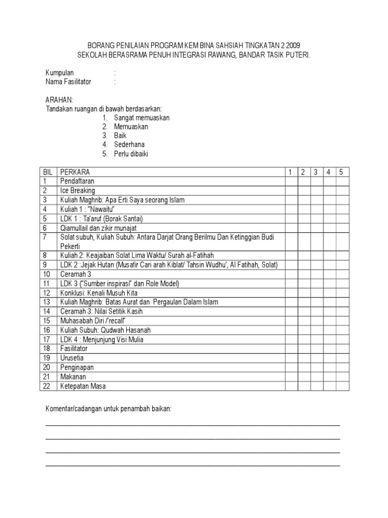 Contoh Borang Penilaian Program Lertyi from lh4.googleusercontent.com Secara keseluruhan, bagaimana anda menilai modul ini? Borang penilaian sebelum dan selepas program. Adakah konsep (teori) diterangkan dengan jelas? Adakah kursus berjalan dengan sempurna? Borang penilaian keberkasanan kursus (terkini.xls Sila berikan penilaian berdasarkan skala berikut: Upsm/c/4 borang penilaian keberkesanan kursus dalaman butir pegawai yang dinilai nama : Borang maklum balas kerja kursus pdf document.
